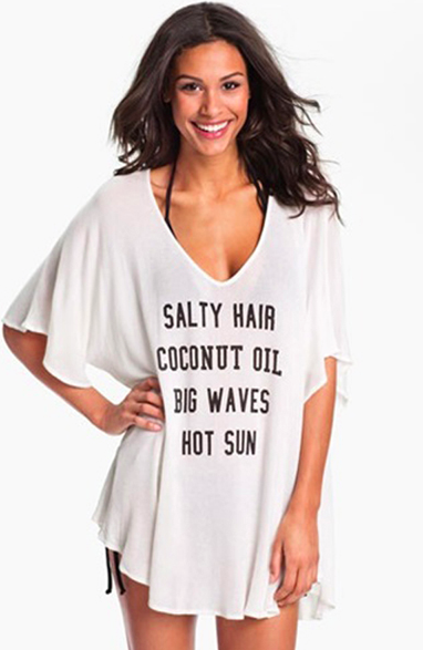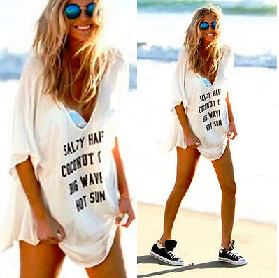 Luźna damska rozszerzana dołem damska bluzka z szerokim rękawkiem. Duży dekolt. Kolor biały. Nadruk. Przewiewna bawełna.