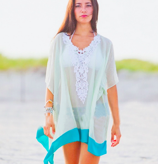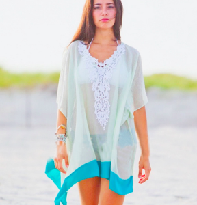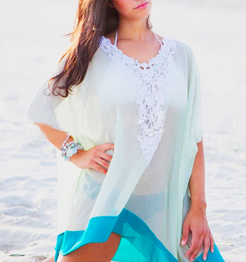 Śliczna zwiewna tunika Bikini CoverUP. Wykończony koronką dekolt, opadające ramiona, rękaw 3/4. Bardzo delikatna tkanina. Całość wykończona szerokim turkusowym pasem. Bardzo kobieca.