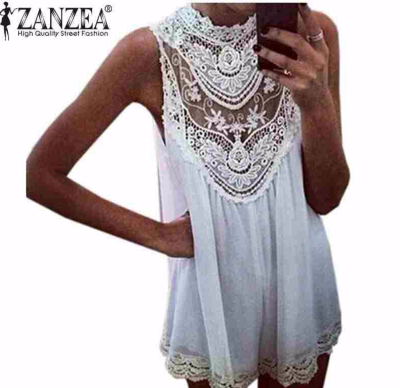 Delikatna, urocza tunika Vintage Mini Dress, bez rękawa, zdobiony koronkowym motywem karczek, lekko rozszerzana dołem, koronkowe obszycie na dole.