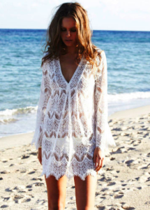Śliczna koronkowa plażowa sukienka, duży dekolt w serek, długi rękaw. Romantyczny motyw w stylu Vintage. Kolor biały.