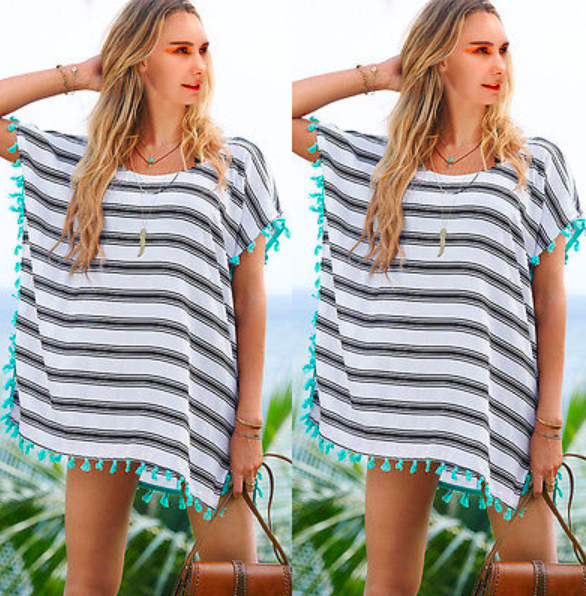 Śliczna tunika plażowa w paseczki, wykończona frędzelkami. Jeden uniwersalny rozmiar 36 - 44